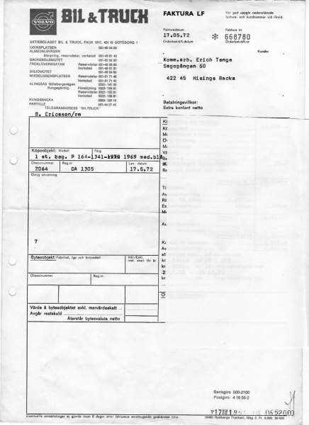 Information angående volvo 164 reg EFM415. Vi bodde i Gøteborg. Min far kjøpte den 17.05.1972.